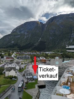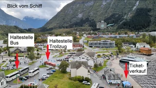 Tickets für den Trollzug und auch für Bustransfer zum Voringsfossen gibt es in einem kleinen blauen Zelt direkt neben dem Schiff.